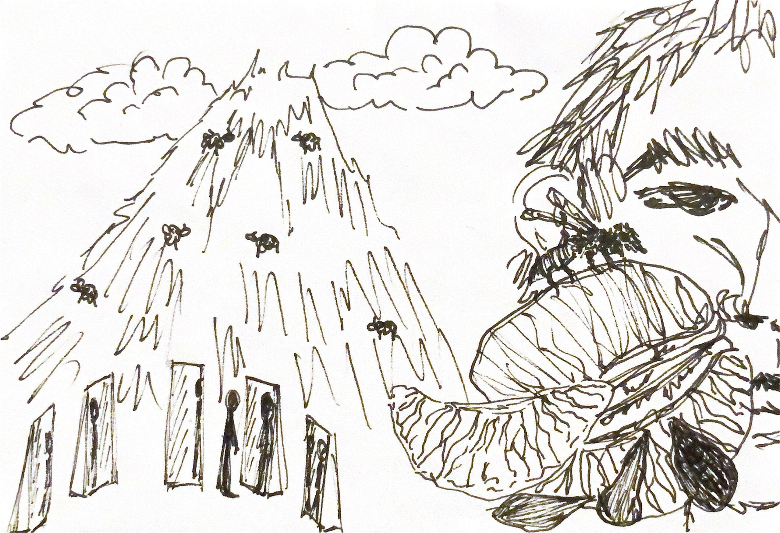 między nimi dryfuje pszczoła, zdradzona kwiatami.